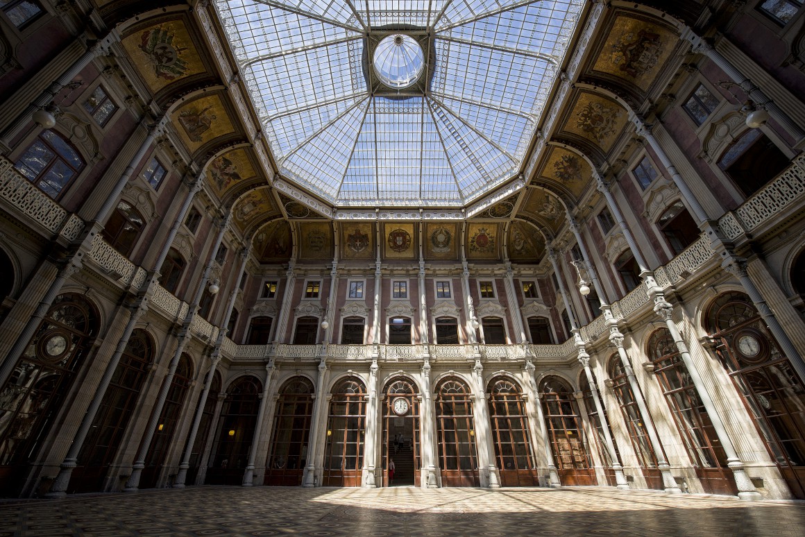 Le point quiattire le plus l'attention dans cette cour est un dâme en fer et en verre. C'est une structure impressionante, difficile de faire correspondre, entourée fout autour par 20 blasons représentante les pays avec lesquels le Portugal avait à l'époque des relations amicales et commerciales, comme son nom l'indique.